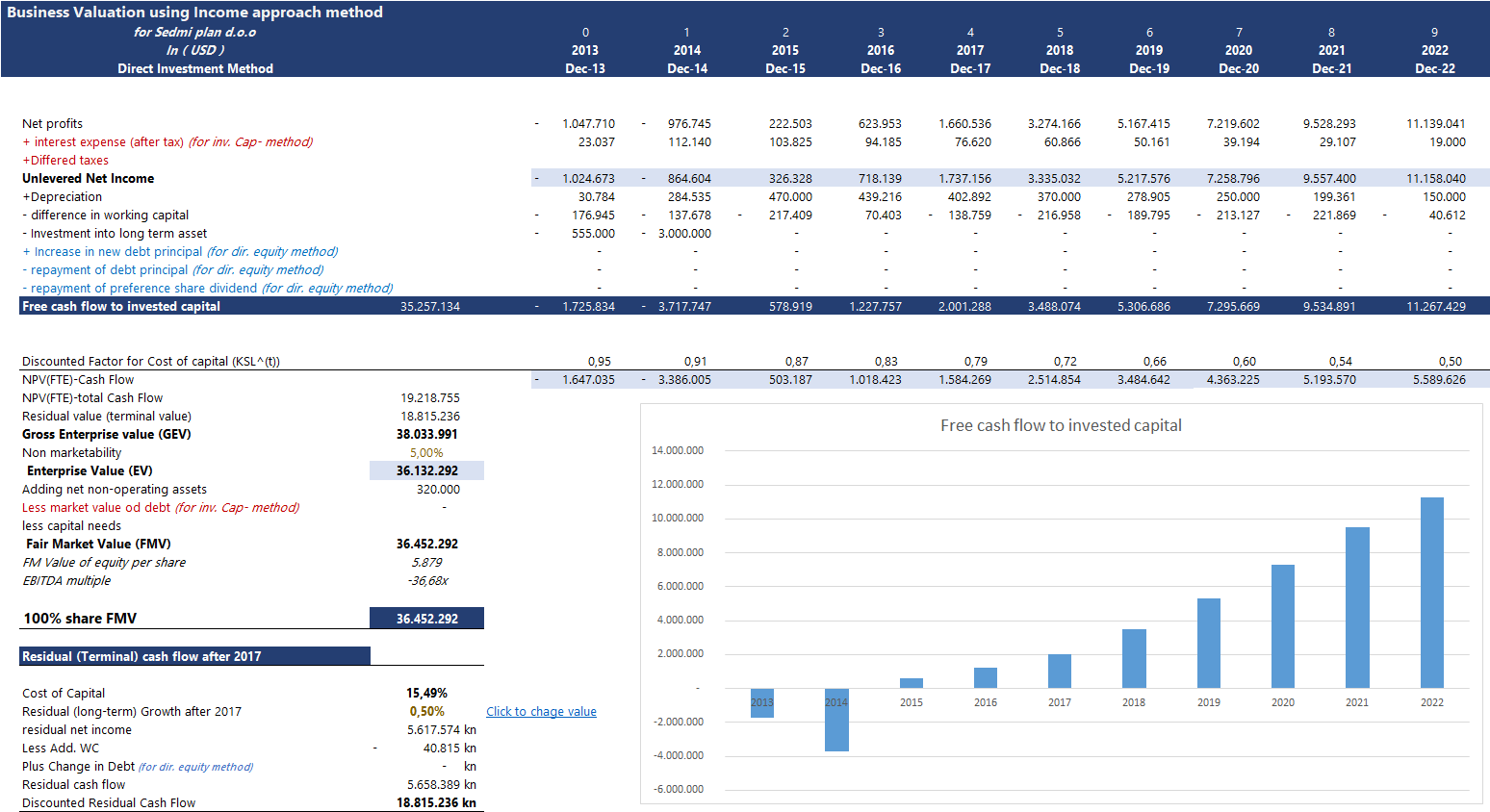 The business valuation model automatically generates Free cash flow depending on your method and takes the appropriate discount factor (DF).