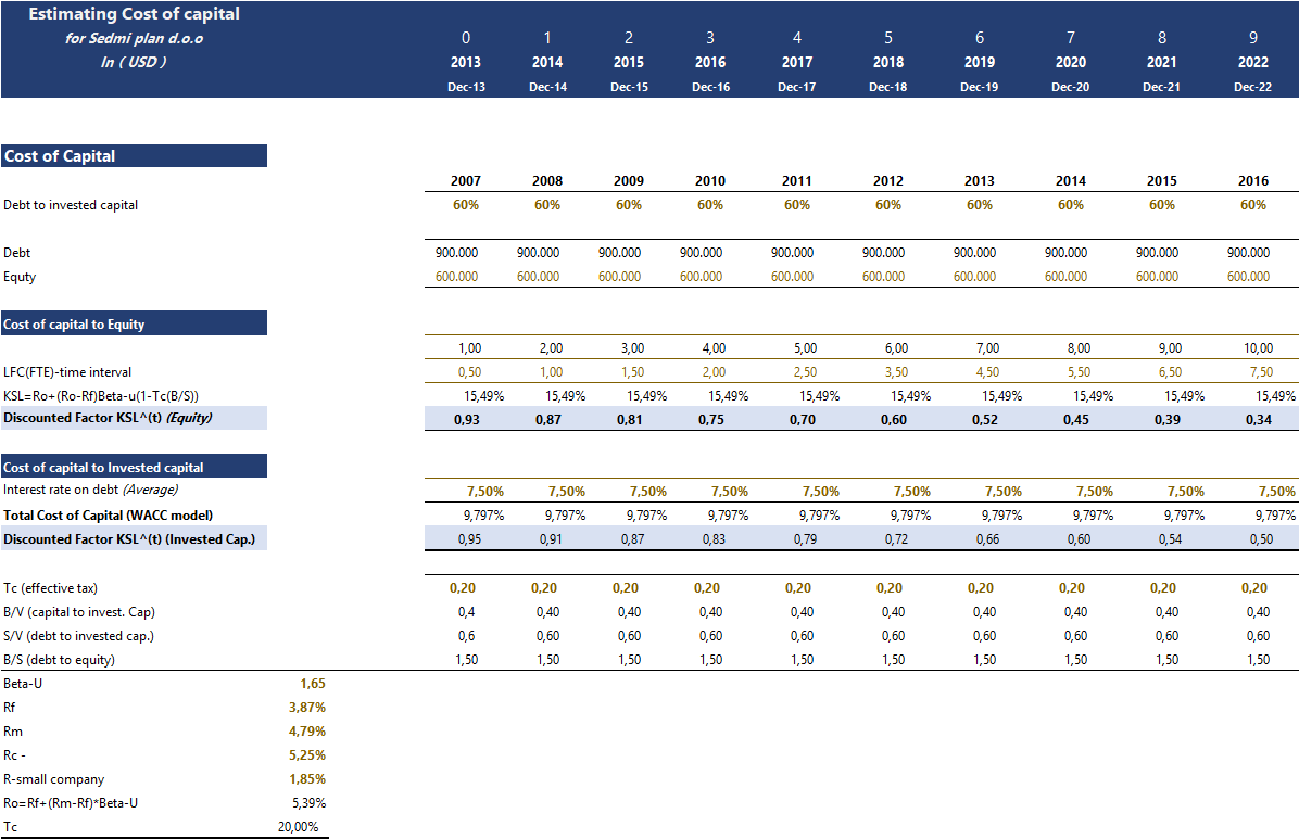If you choose an Equity method, then it will use only the cost of capital to equity holders and use the CAMP model to derive to approximation of DF. Besides a standard CAMP model parameters, we use additional risk factors such as Country risk and risk for small companies (Darmodian approach)