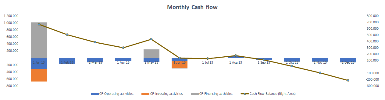 Here you can inspect the generation of cash flow on monthly basis and help you in fine-tuning your financial model assumptions.