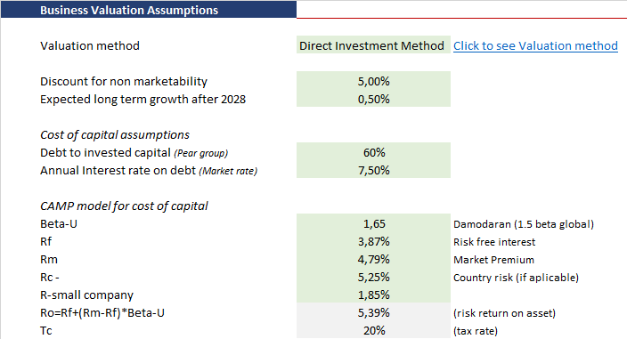 to get approximate input variables for your company or project, you need to look at similar companies or projects. It is not easy to find the right inputs, but you can approximate numbers in a way that is easily explainable to investors. After all, it is important to know how did you come up with discounting factors that are calculated on the business valuation sheet.