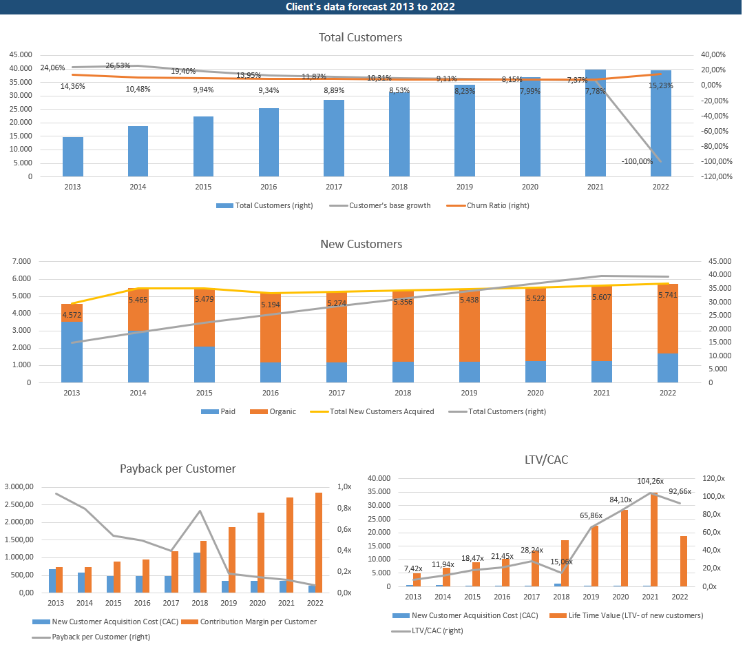 Last two diagram represents the acquisition cost you invested into a new customer, Contribution margin and payback time, as well as change in Lifetime value and LTC/CAC ration over the planned time.