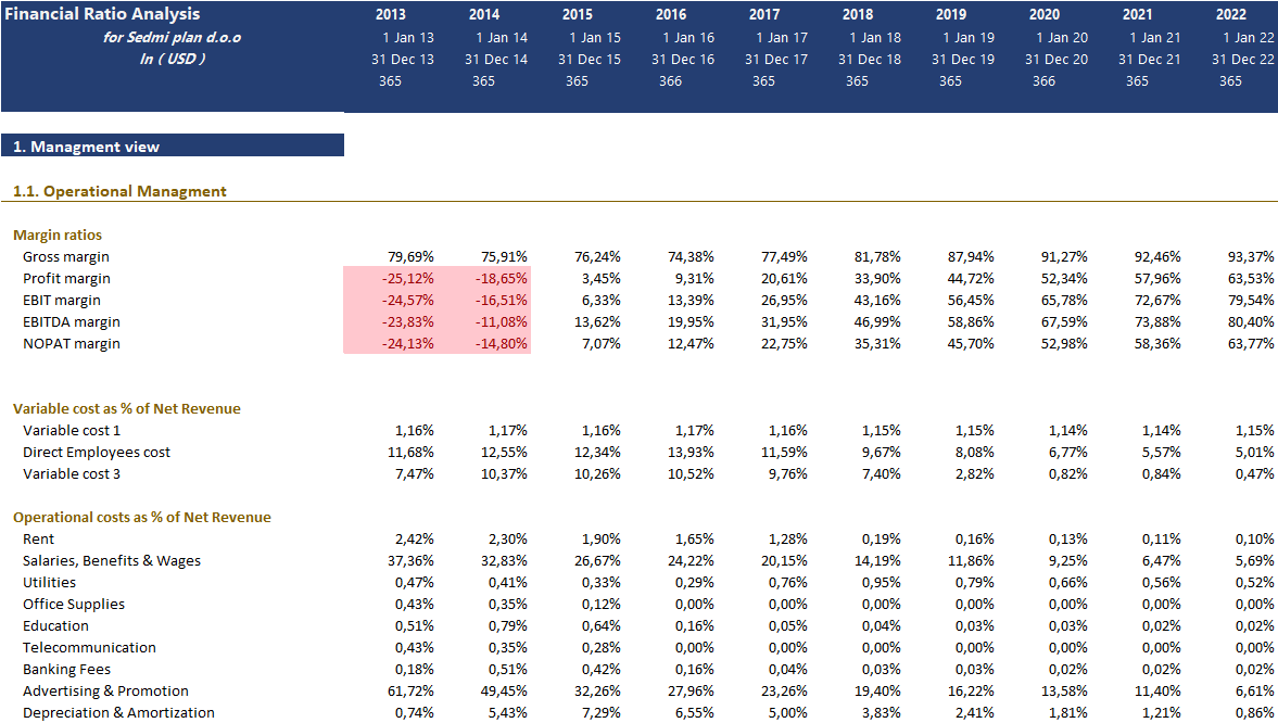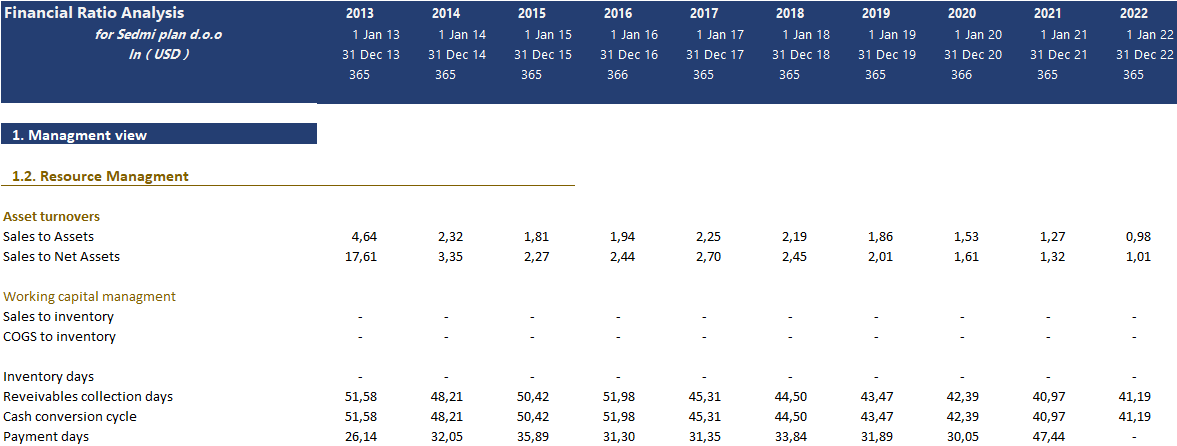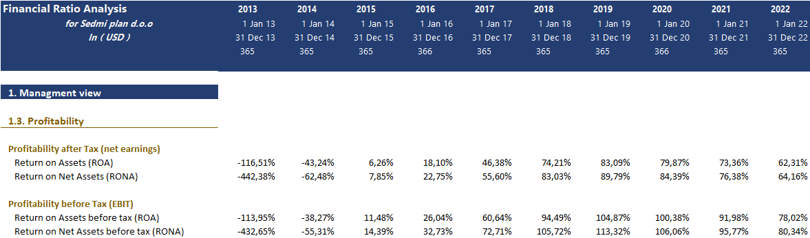 The model has provided 3 groups of financial ratios, depending on the user's view. Management view, Financial sustainability, and Owners and investors view.