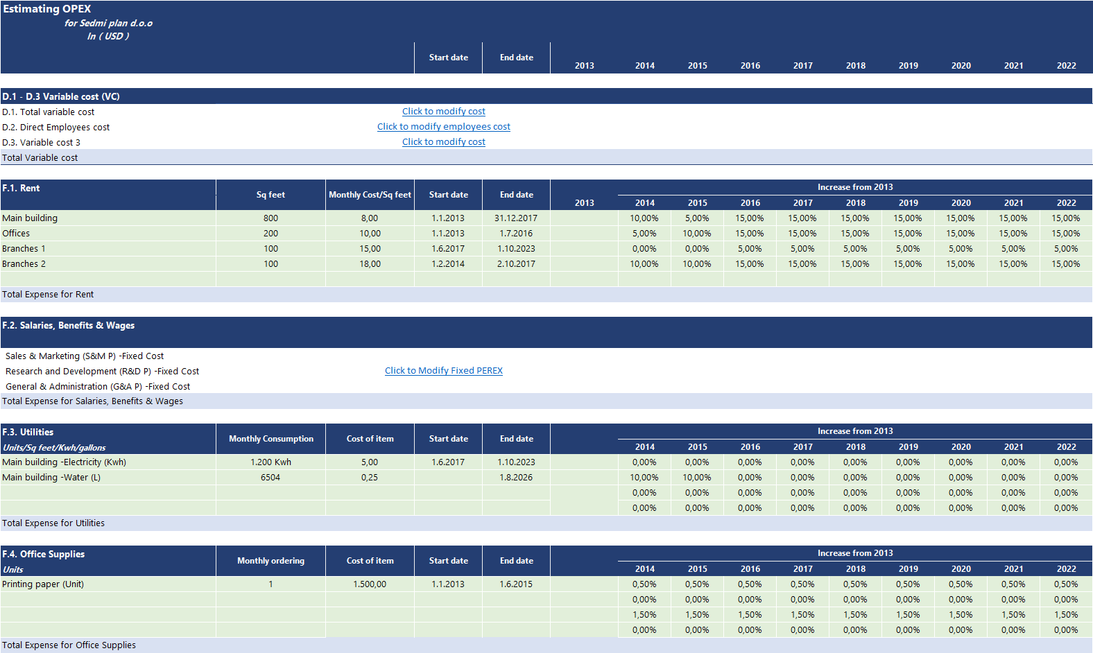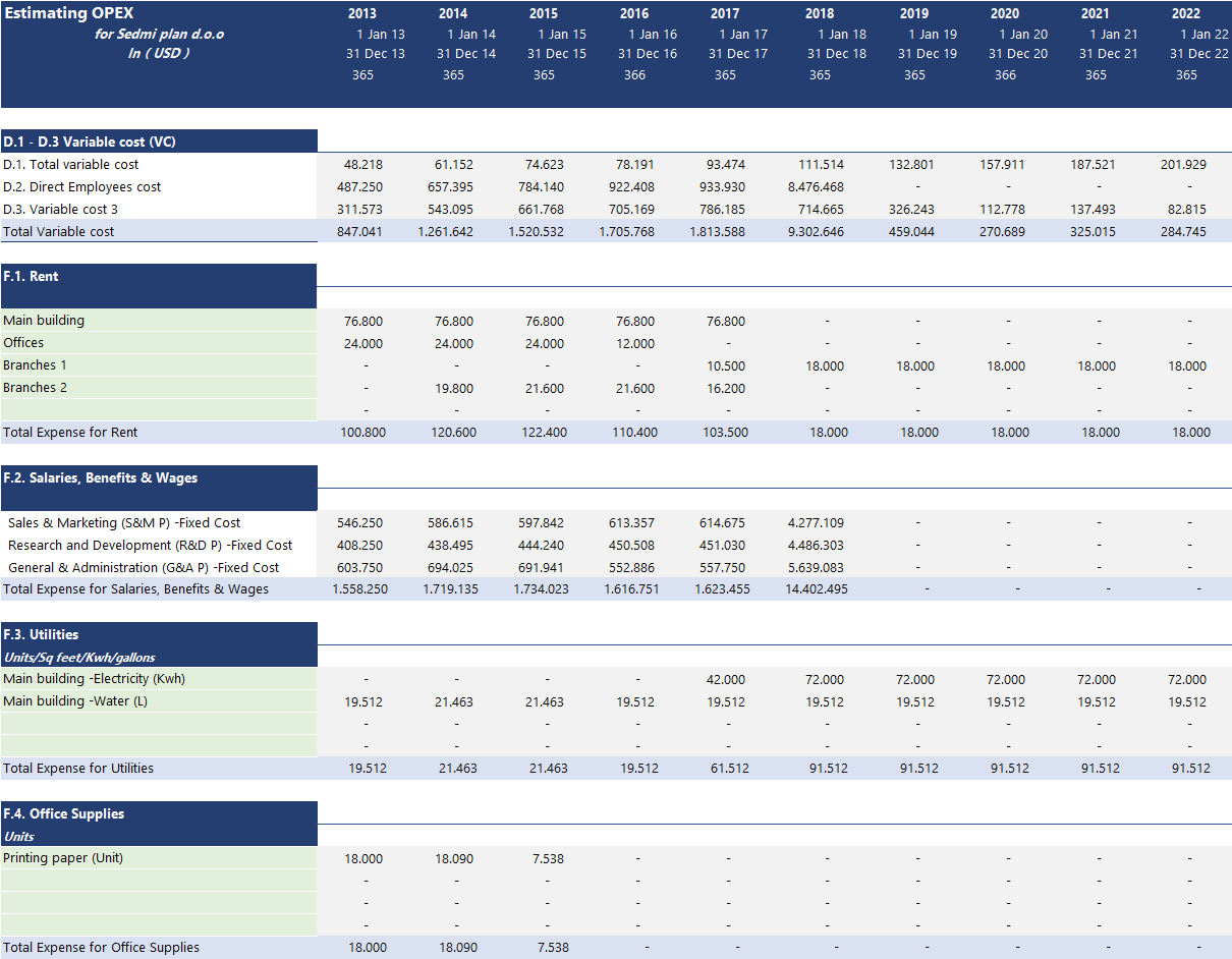 This section is all about operational expenses (OPEX). Generally, operational expenses represent fixed costs, meaning that the cost does not intend to move with the number of orders in a short time. They do increase, only on a longer period when a maximum capacity has been reached. An example of OPEX cost is office rent. It is a fixed cost for a certain number of m2 per employee for a limited time. Due to increased business operation, you would need more employees and more office space to rent. Therefore, in the long run, OPEX cost intends to increase with business activity, but within one year time, they remain still.