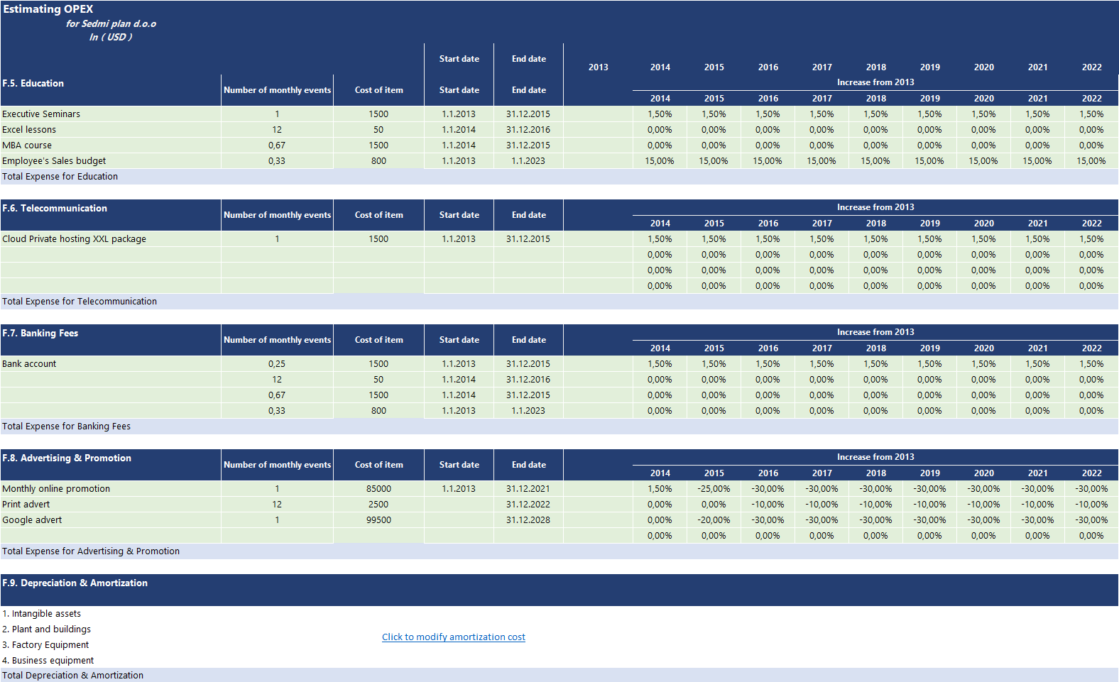 The model has 9 major groups of OPEX. Within each group, you can enter 4 cost items that have similar attributes. Besides 7 custom groups, two OPEX groups are reserved for Amortisation and depreciation cost and Salaries and benefit. Those costs have their section where each cost is computed automatically depending on other sub-models and their drivers.