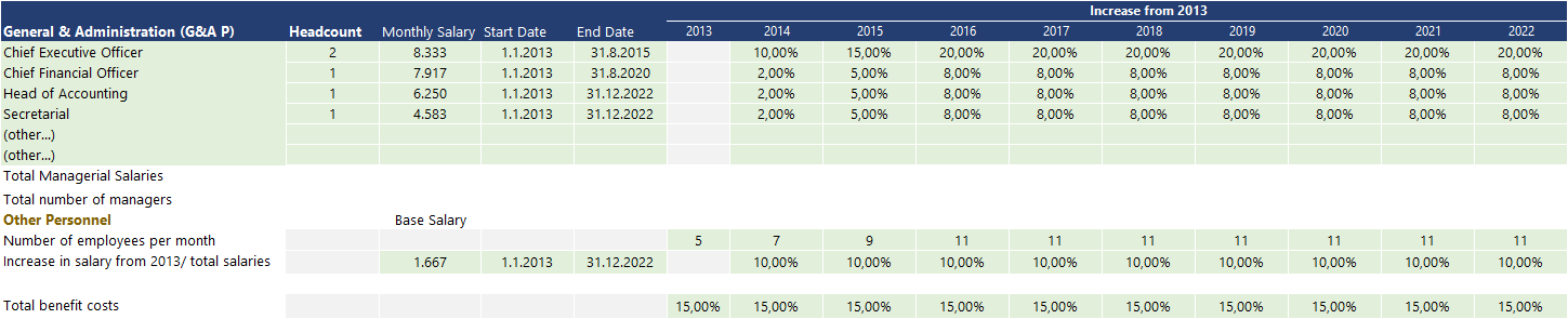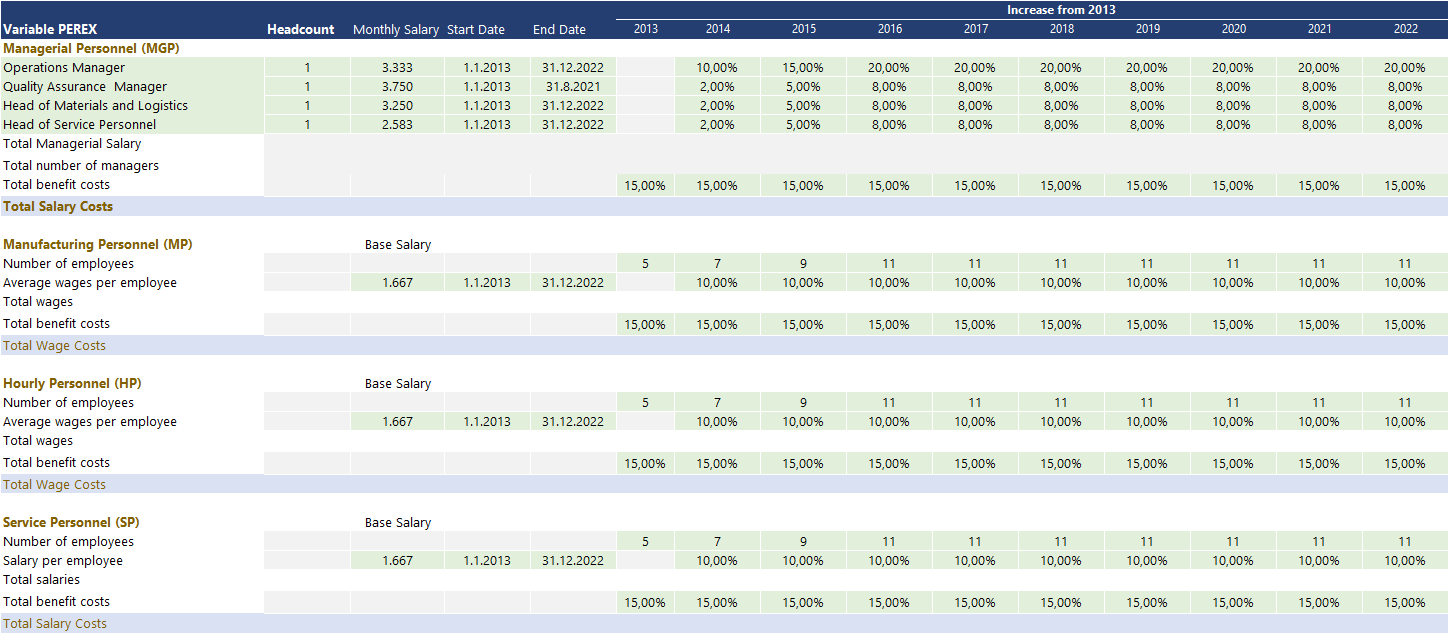 Variable Vs fixed cost: In terms of cost movement, General PEREX expenses are fixed costs that tend to move in the long run. The model has a build start and end dates for each individual position so you can tailor the Expense according to your hiring plans. Direct variable personnel expenses are a variable expense that tends to move along with the operational activity.