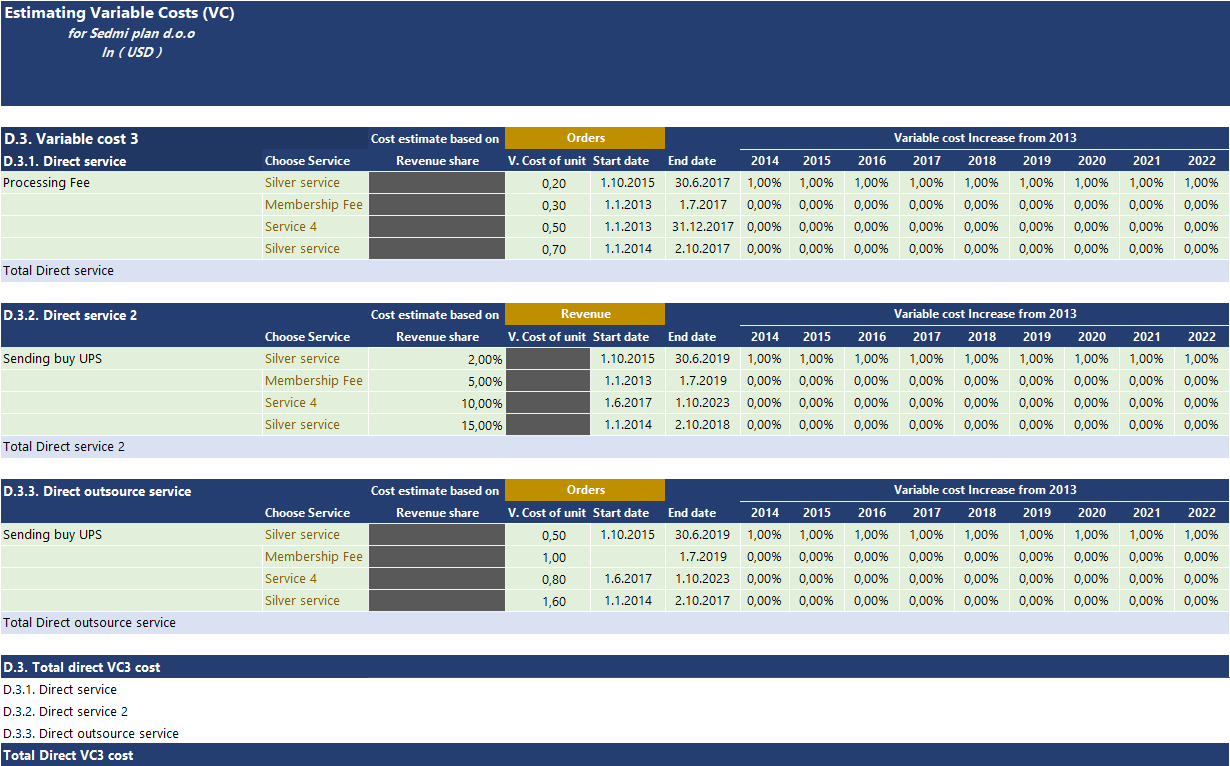 This model has built-in 3 types of variable costs to use for different purposes. The first two variable cost types (cost of goods sold and direct employee costs) are shown in this sheet for reportnig, while the estimation of those costs is done through respective separate sections.