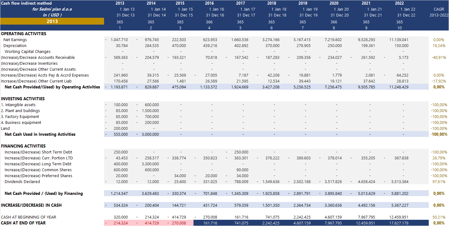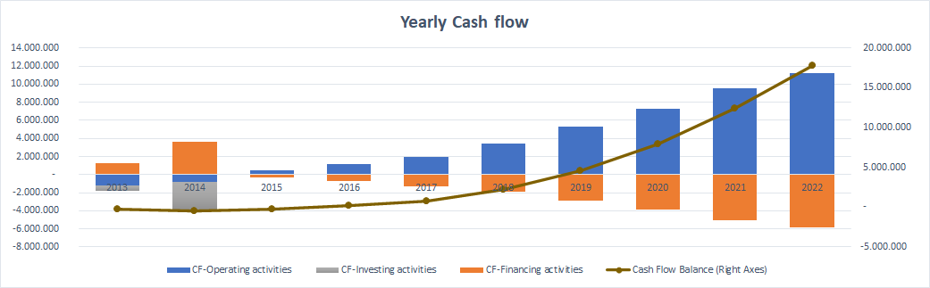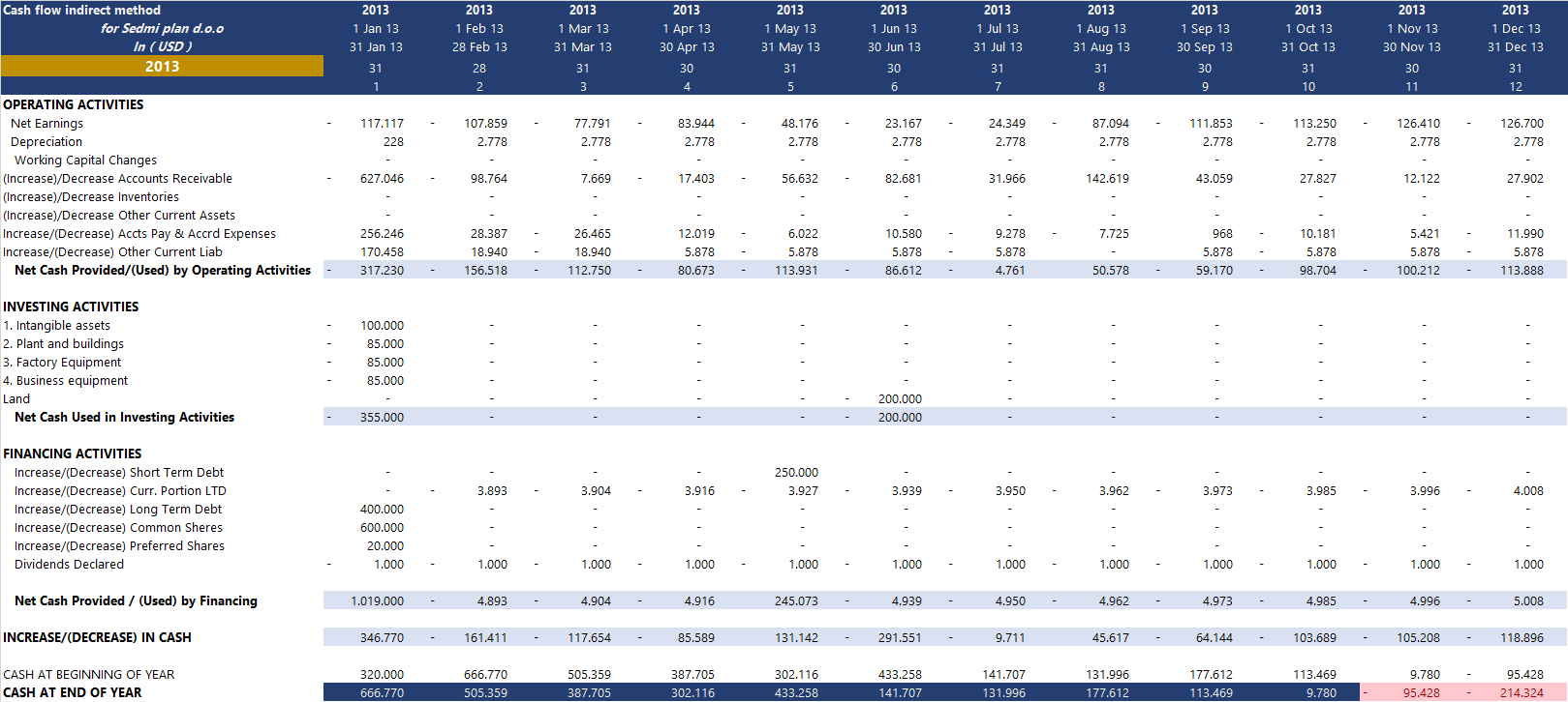 Here you can inspect the generation of cash flow on monthly basis and help you in fine-tuning your financial model assumptions.