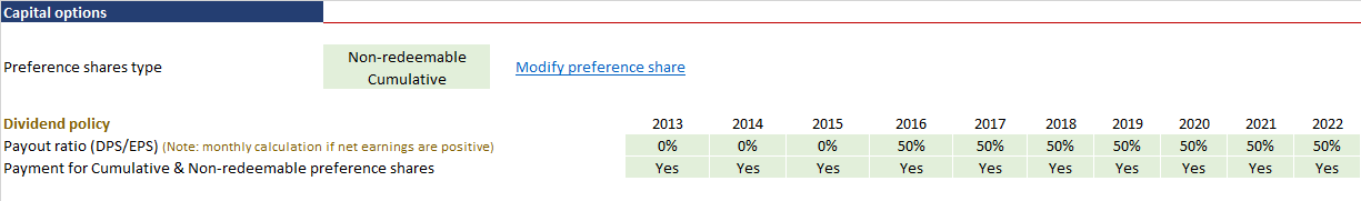 Payment for cumulative and non-redeemable shares: In this cell enter your decision to initiate payment for cumulative and not paid interest on preference shares.
