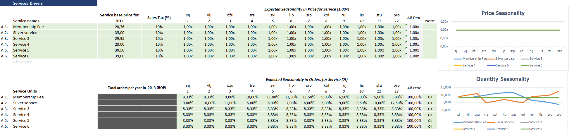 Expected seasonality in price for1-12: Enter the multiplier of the base price for each month. A multiplier of 1,00X means that the monthly price will be equal to the base, while multiplies of 0,95X means that the monthly price will be 5% lower comparing to the base price.