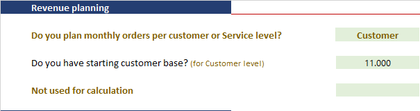 Total orders in starting year: enter number of orders (sales units) for 1st year of the planning horizon. (note: if you chose to estimate revenue plan based on customer base, this cell will be in gray color, meaning that it is not used for calculation).