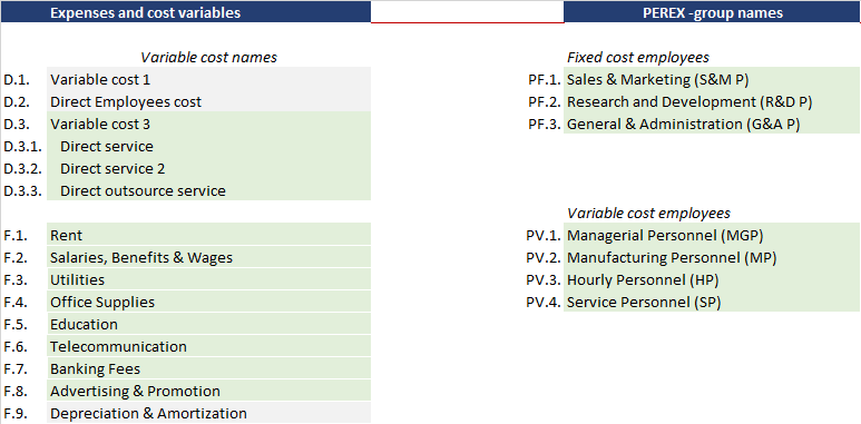 In the financial model, direct employee expenses entered in the PEREX sheet are not linked directly to each product or service. Use this table to reallocate the estimated variable cost to each product line. Some specific financial models will have an estimation that is directly linked to the product, but the general model uses percentages for allocating cost.