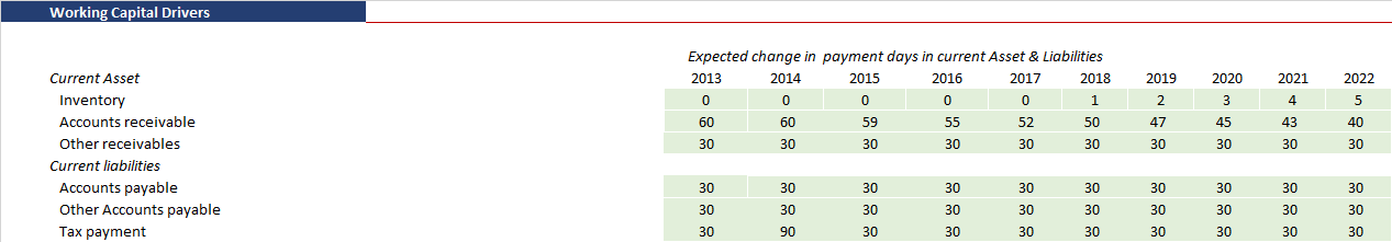 Working capital assumptions are important drivers of the financial model. The drivers are used to calculate the monthly balances of trade receivable, suppliers payable, stock (if used in product), tax obligation, and other components of your short asset and liabilities that were derived from operational activities.