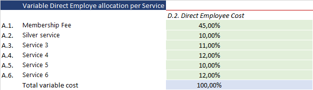 Direct employee Cost: enter the percentage for each product or service. The sum of all percentages needs to be equal to 100,00%