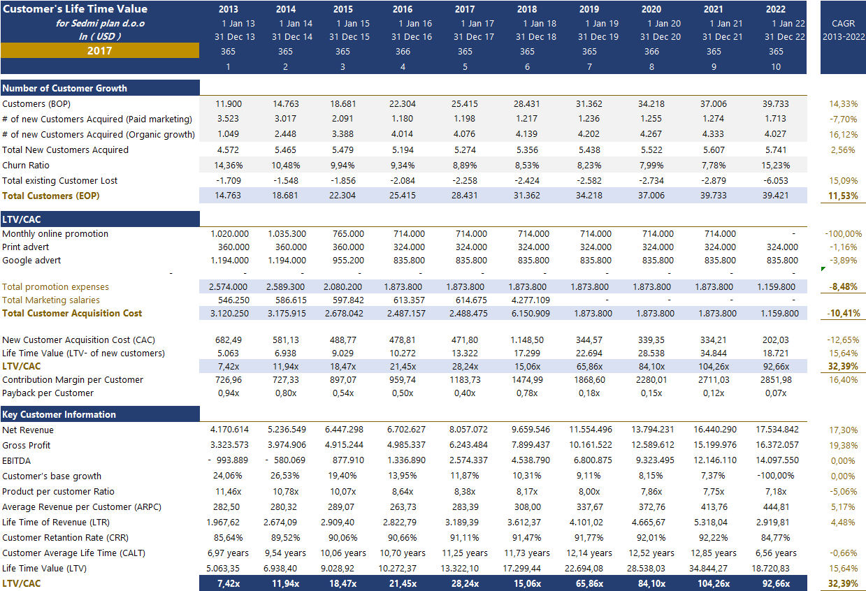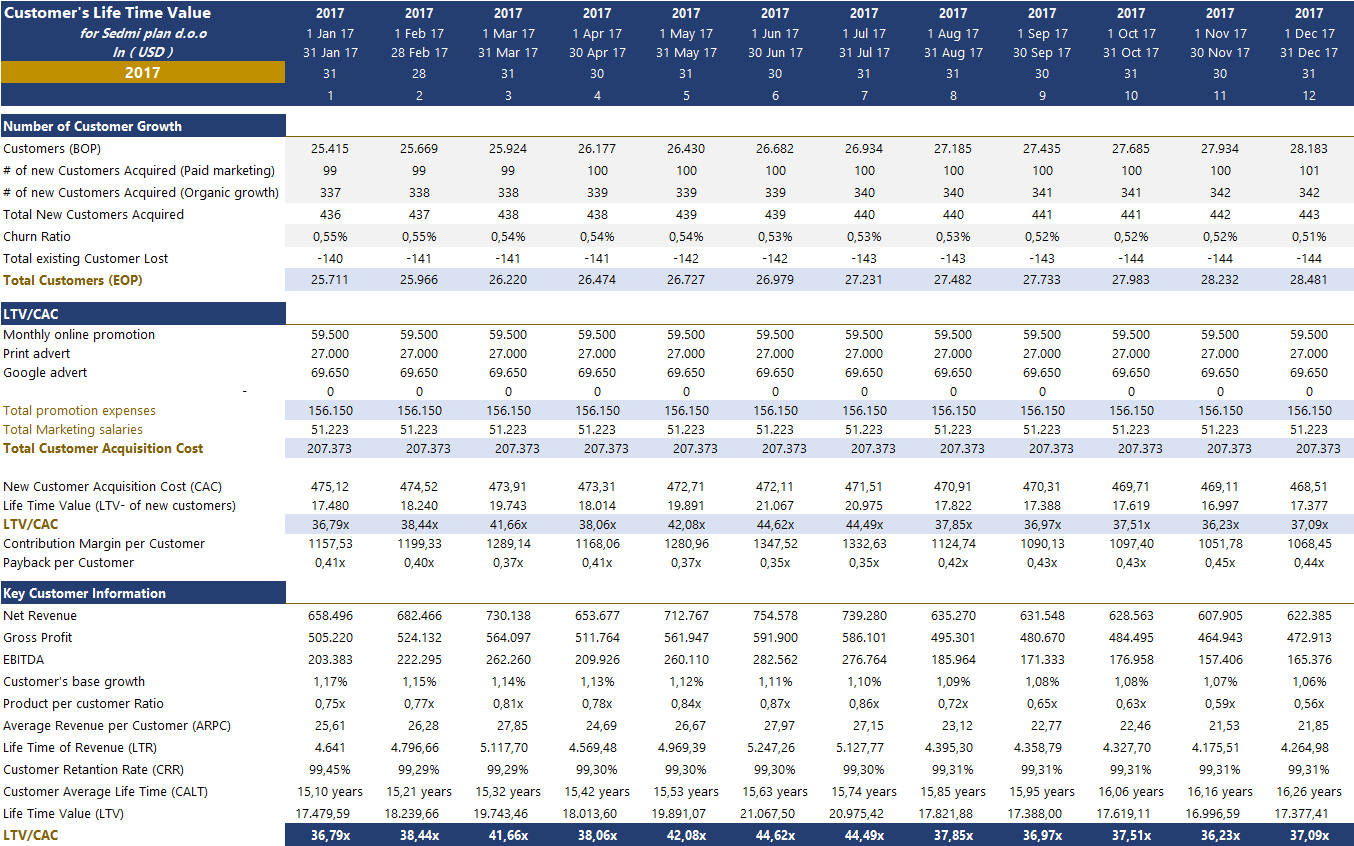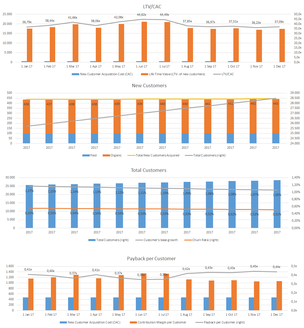 - Monthly overview of customer's growth, LTV/CAC ratio, and Key customer information
