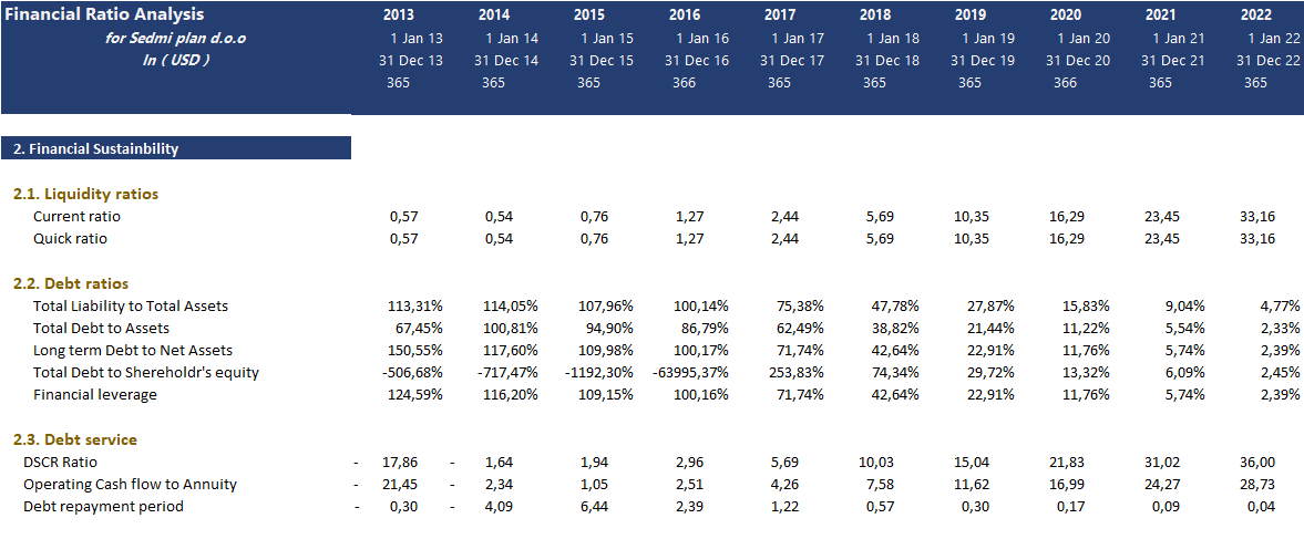 - Financial sustainability has key financial ratios concerning how well the magnet handles the company's liquidity and ability to service outstanding debt. Also, it gives the level of debt over the equity ratios.