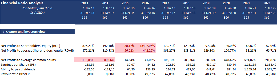 - Owners and investors view have a set of financial ratios about investors return, ability to pay dividends, and dividend payout ratio.