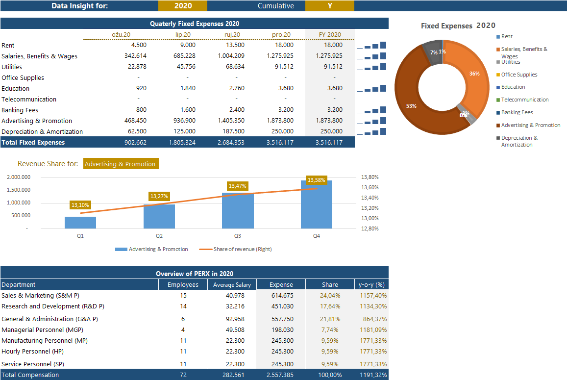 The right side of the Operational Dashboard gives insight into an estimate of fixed expenses every quarter for each year. You can choose cumulative or quarter by the quarter view. Data insight visually displays an expense to revenue ratio for every fixed OPEX every quarter.