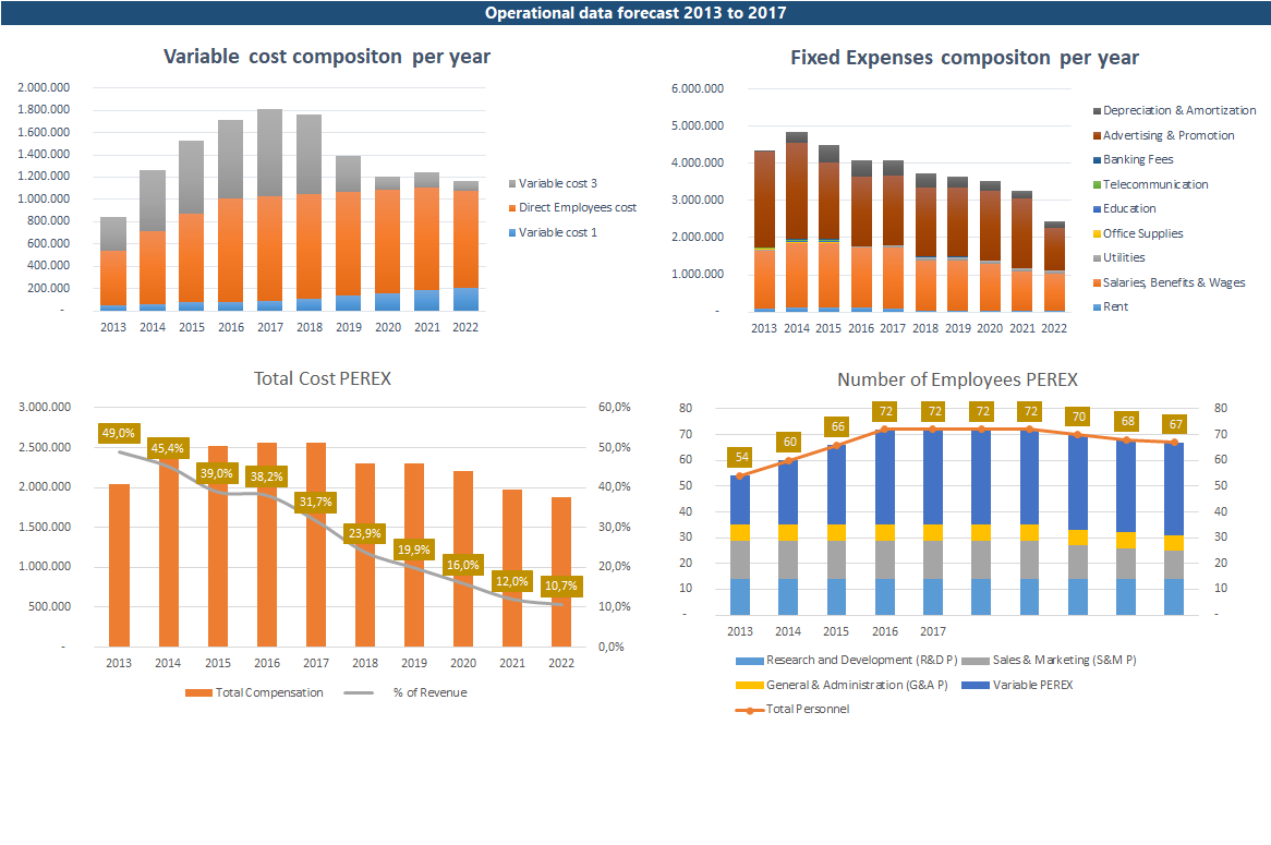 Operational Dashboard gives you more insight into estimated fixed OPEX on a quarterly level for each year. Also, it visually displays the composition of variable and fixed and employee expenses throughout the planned period.