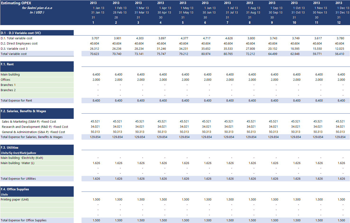 This section is all about operational expenses (OPEX). Generally, operational expenses represent fixed costs, meaning that the cost does not intend to move with the number of orders in a short time. They do increase, only on a longer period when a maximum capacity has been reached. An example of OPEX cost is office rent. It is a fixed cost for a certain number of m2 per employee for a limited time. Due to increased business operation, you would need more employees and more office space to rent. Therefore, in the long run, OPEX cost intends to increase with business activity, but within one year time, they remain still.