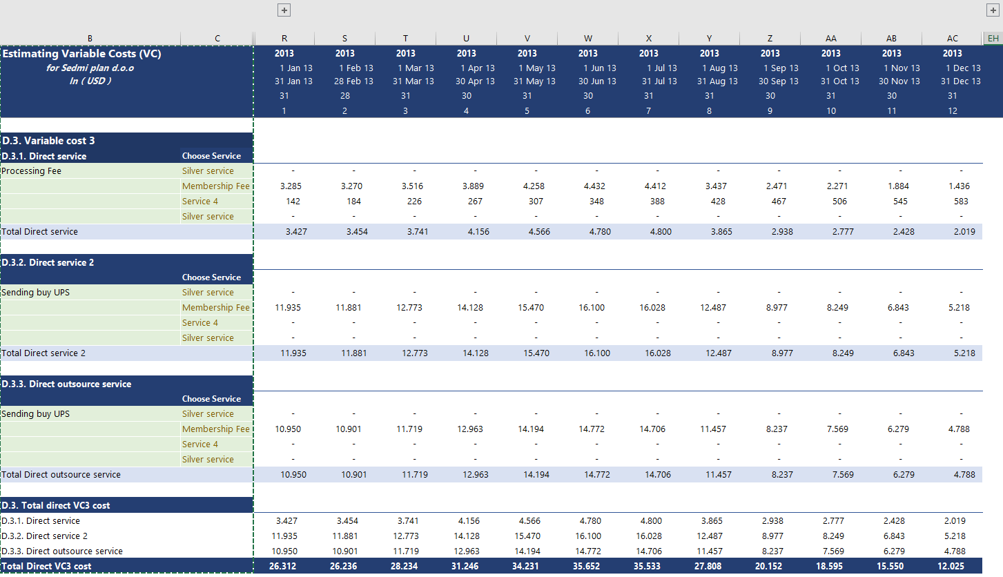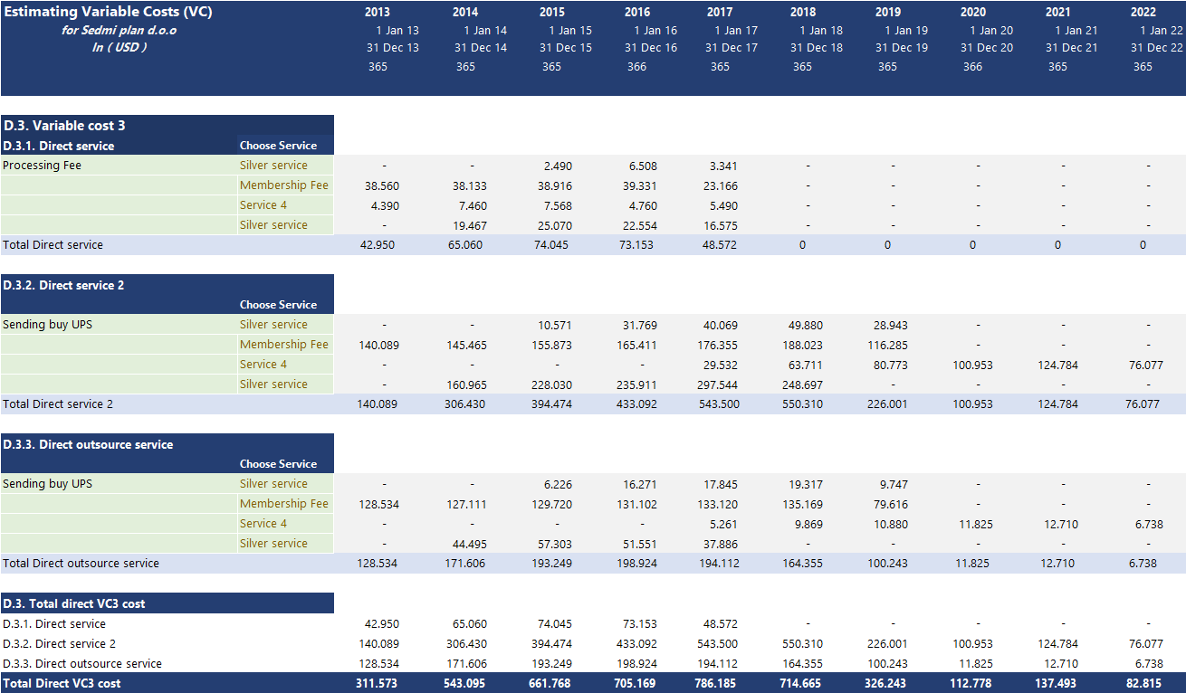 This model has built-in 3 types of variable costs to use for different purposes. The first two variable cost types (cost of goods sold and direct employee costs) are shown in this sheet for reportnig, while the estimation of those costs is done through respective separate sections.